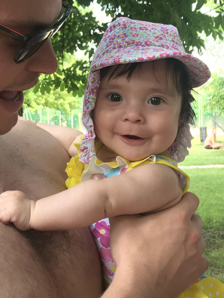 Most másfél éves Hanna. Még nemigazán fedezte fel azt, hogy nekem más a hallásom – az implantomat viszont eddig nem próbálta levenni, megfogdosni. Sejtheti, hogy ezzel hallom a hangokat, de általában a szemüvegemmel szórakozik inkább.
